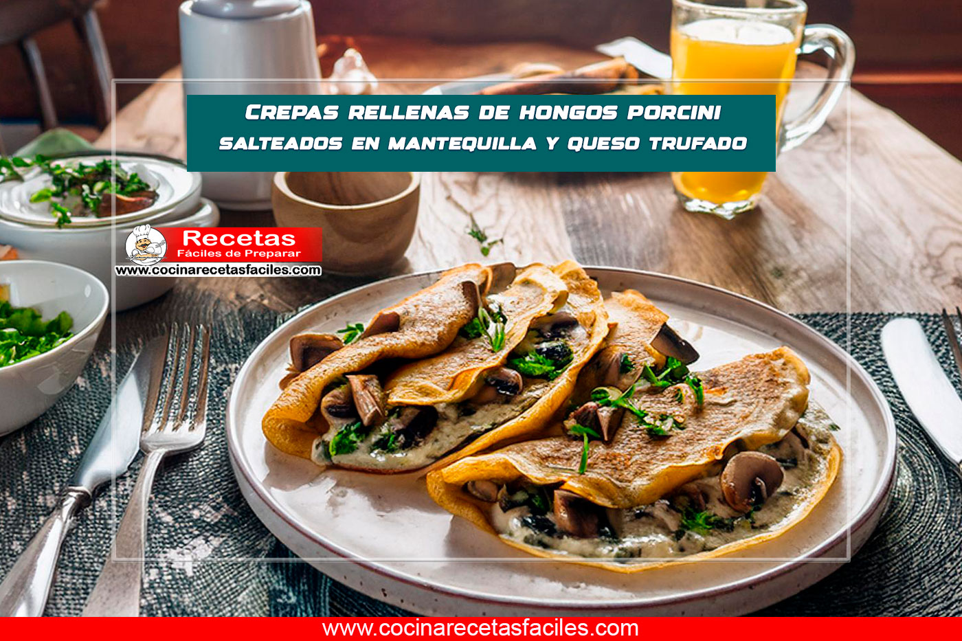 - Sirve las crepas rellenas calientes, acompañadas de Ensalada Verde con Vinagreta de Mostaza, Pan Integral Casero y Té de Hierbas Caliente.