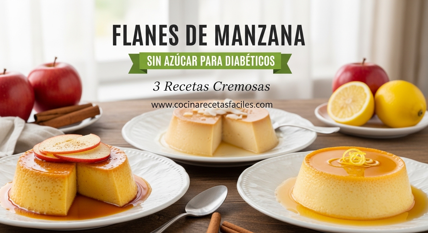 Varía con esponjosos como el bizcocho de yogur para diabéticos, listo en hora y cinco minutos para 185 kcal por rebanada con 3.2g de fibra de la harina de almendra que estabiliza la glucosa, más probióticos del yogur para salud intestinal. Frescor cítrico llega en el bizcocho de naranja sin azúcar, horneado en 40 minutos con zumo y ralladura que aportan vitaminas y fibra natural, stevia para dulzor cero impacto y yogur que sacia sin elevar el azúcar. ¿Textura sedosa? Los flanes de manzana sin azúcar fáciles: 3 recetas con maicena y sin horno se cuecen en 60-80 minutos, de 88 a 120 kcal con 2-3g de fibra de pectina que frena la absorción de azúcares, canela para sensibilidad insulínica y manzanas de bajo IG.